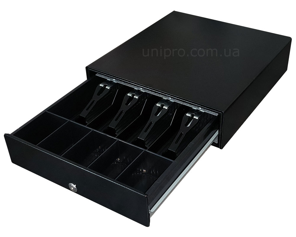 Надежный, металлический выдвижной денежный ящик BDR-100H. Может открываться как программно, управляющим сигналом, так и механически.